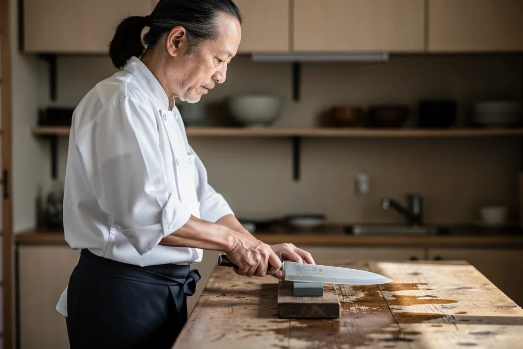Les méthodes d’entretien appliquées au Japon diffèrent sensiblement des pratiques plus courantes ailleurs. Ici, la pierre à aiguiser traditionnelle tient une place centrale. Elle offre un contrôle total du geste et une maîtrise de l’angle impossible à obtenir avec des systèmes mécaniques standardisés.